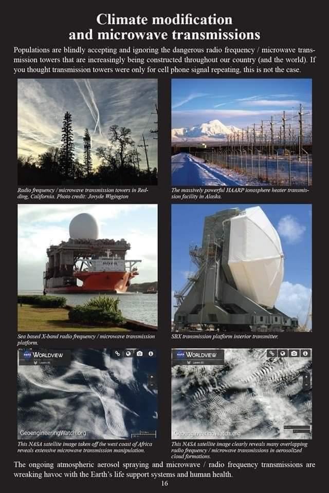 La pulvérisation de particules de métaux lourds signifie augmenter la conductivité atmosphérique (le réchauffement de la planète ou le changement climatique est l’article de couverture), qui, s’ils sont utilisés avec ces appareils de chauffage, sont utilisés pour créer toutes sortes de catastrophes « naturelles », comme allumer des incendies qui brûlent des maisons au lieu d’arbres, créer des tremblements de terre, modifier les propriétés électriques de l’atmosphère pour crée des ouragans, des tornades et des inondations.
