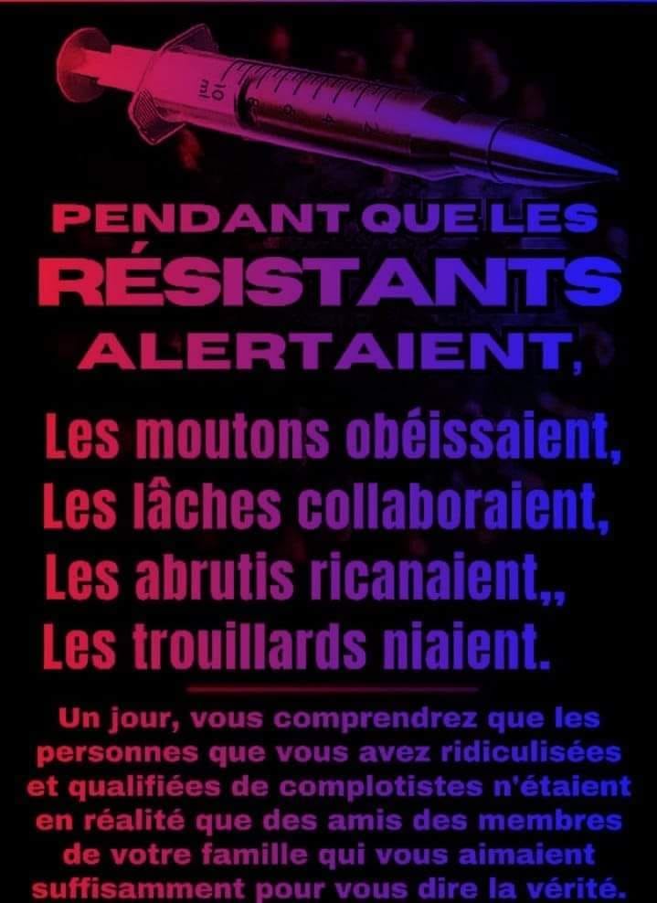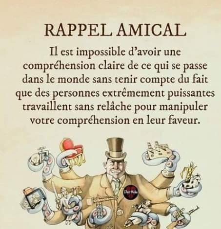 Il faut savoir aussi ceci. Il y a manipulation, il faut décortiquer et rechercher dans quel but à été fait ceci, il y a une grande manipulation pour informer le peuple à se révolter afin qu il y ai une grande révolte, ensuite scénario loi martial ou autre, contrôle sociale, grand reset…. Attention aux pièges qui nous amènerons à croire au bon combat alors que tout est sous contrôle pour un gouvernement mondial à la clé finale.